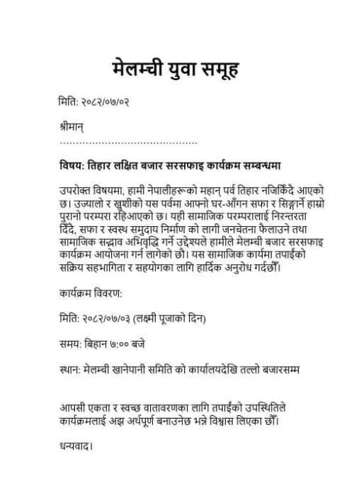 मेलम्ची युवा समूहको आयोजनामा मेलम्ची बजार सरसफाई गरिने भएको छ । समूहले तिहार लक्षित बजार सरसफाई कार्यक्रम गर्न लागिएको हो। तिहार पर्वलाई उज्यालो र खुसीको पर्वको रूपमा घर आँगन सफा र सिँगार्ने पुरानो परम्परालाई जोगाउने उद्देश्यका साथ बजार सरसफाई कार्यक्रम गर्न लागिएको समूहका एक सदस्य प्रदिप धितालले बताउनुभयो । कार्तिक ३ गते लक्ष्मी पूजाको दिन बिहान ७ बजे समूहको आयोजनामा हुन लागेको यस कार्यक्रममा सक्रिय सहभागिताका साथै सहयोगका लागि बुद्धिजीवी समाजसेवी लगायत सबैमा अनुरोध पनि गरिएको छ।