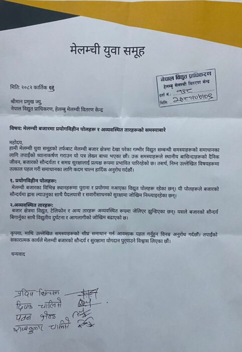 पटक–पटक स्थानीय स्तरबाट माग उठाइए पनि प्रभावकारी पहल नदेखिएपछि, आज मेलम्ची युवा समूहले नेपाल विद्युत प्राधिकरण, हेलम्बु–मेलम्ची वितरण केन्द्रमा औपचारिक ध्यानाकर्षण गराएको छ। समूहका प्रतिनिधिहरूका अनुसार प्राधिकरणले समस्या छिट्टै समाधान गर्ने आश्वासन दिएको छ।